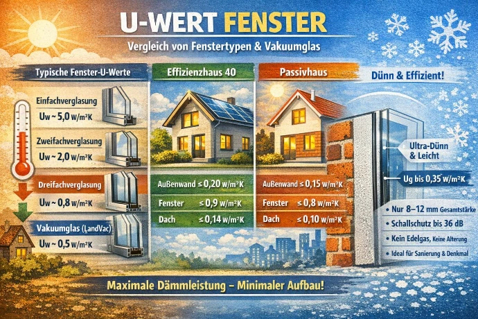 | Vakuumglas (LandVac) | ~0,4 W/m²K | ~0,5–0,7 W/m²K |